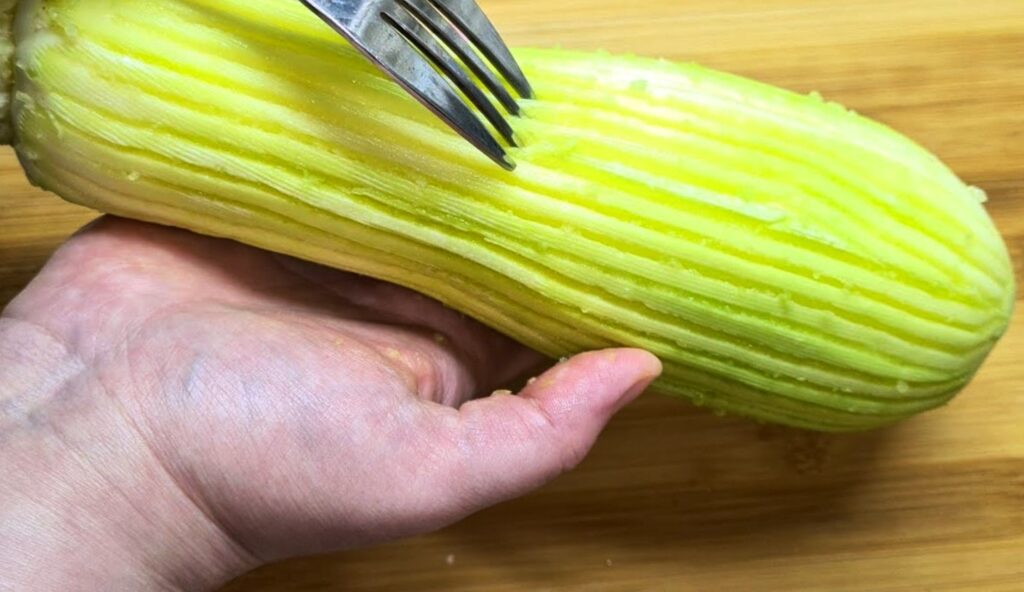 - Очищаємо кабачок від шкірки, виделкою робимо борозни по всій довжині (аби краще увібралася мука)