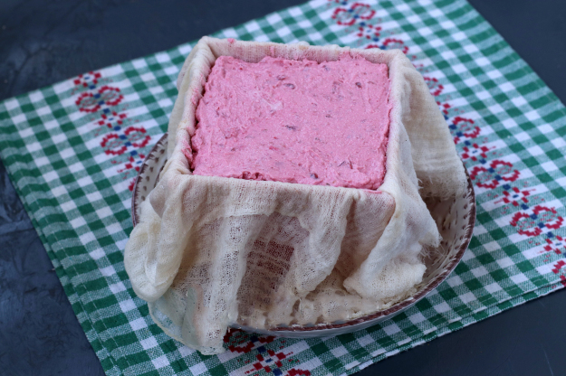 - У такому вигляді прибираємо все у холодильник на 24 години. За цей час періодично зливаємо сироватку.