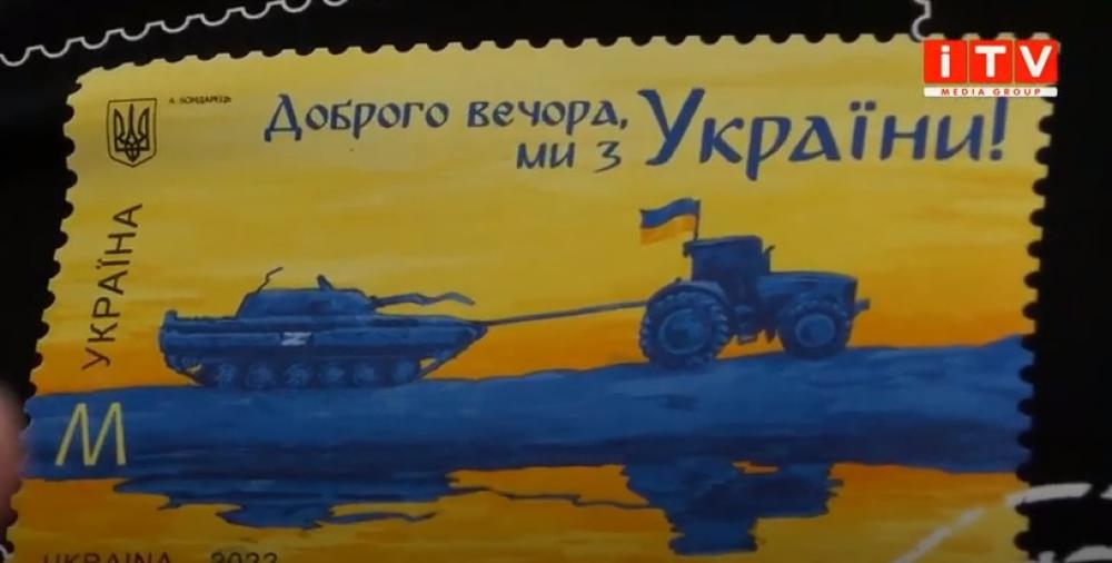 Сьогодні у Рівному відбулося спецпогашення нової військової марки. На ній зображено усім відому картину - де український трактор тягне трофейний танк окупантів. Довершує марку гучний вислів - доброго вечора, ми з України!