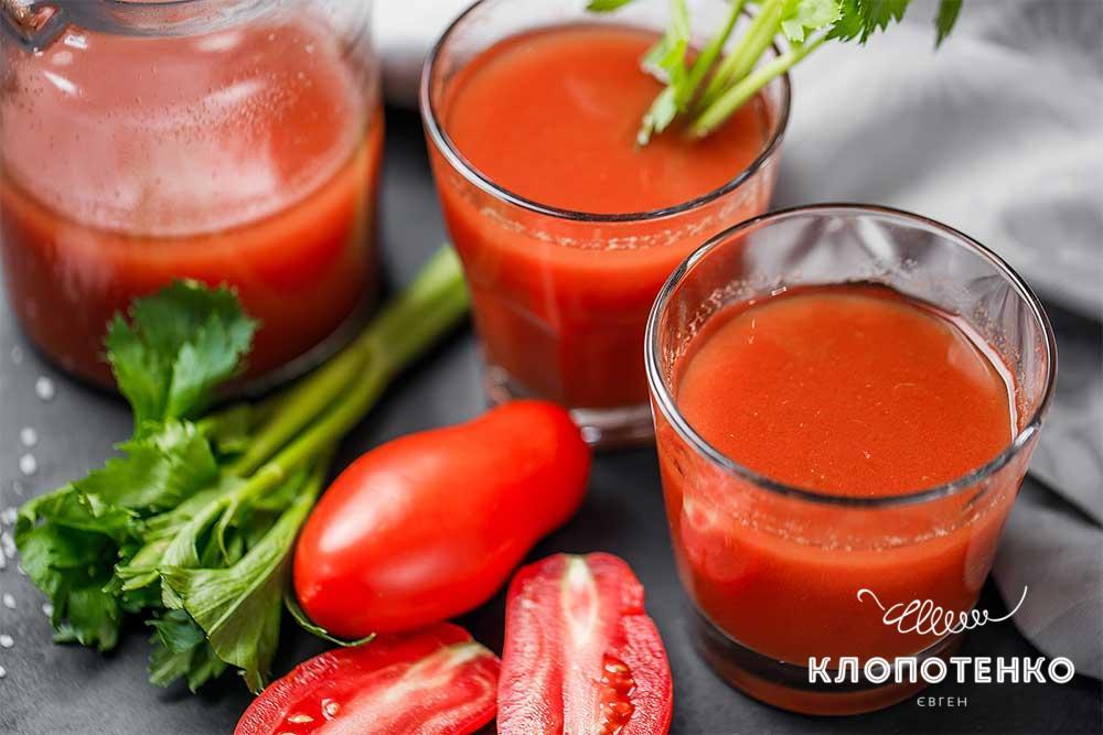 Соковиті кольорові томати класно додавати не тільки до салатів, випічки та супів. Зробити з них сік – теж чудове рішення. Трохи пряної селери та солі – і справжня ароматна душа томатів у вашій склянці. А ще з додаванням томатного соку можна приготувати безліч різноманітних страв.