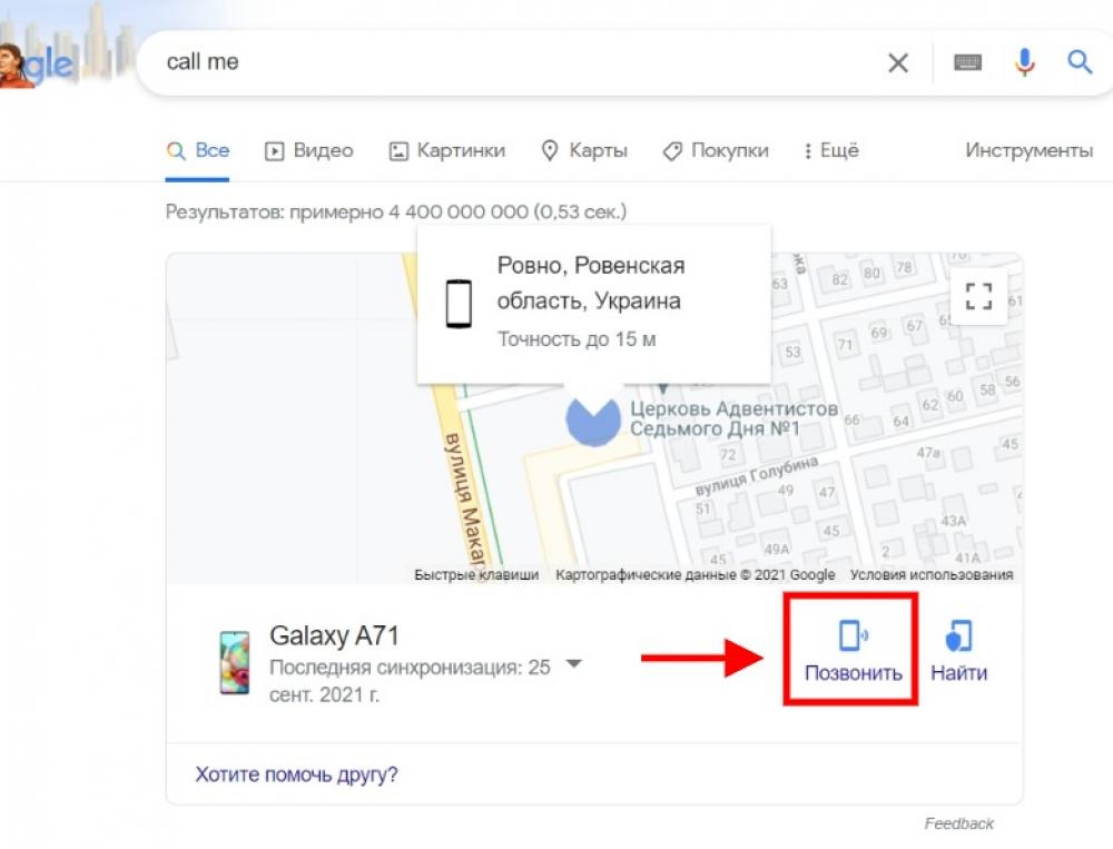Якщо ваш телефон синхронізований з Гуглом, одразу на екрані з’явиться карта, яка визначить місце розташування вашого телефону.