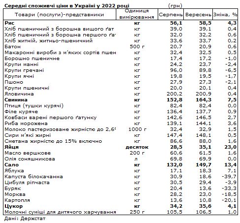 Порівняно із серпнем 2022 року яйця подорожчали на 23,0%, сало на 13,4% до 149,7 гривень за кілограм, свинина на 7,5% до 164,3 гривень за кілограм, яблука на 7,1% до 18,3 гривень за кілограм, рис на 4,3% до 58,5 гривень за кілограм, цукор на 4,1% до 35,6 гривень. за кілограм.