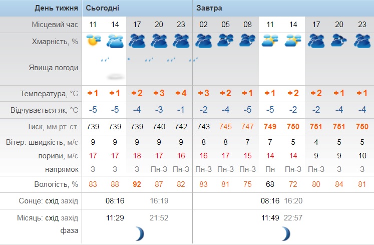 Сьогодні очікується +1..+3 °C, дощ зі снігом, туман, свіжий вітер. Завтра: +2..+1 °C, без опадів, помірний вітер. За інформацією сайту rp5.ua