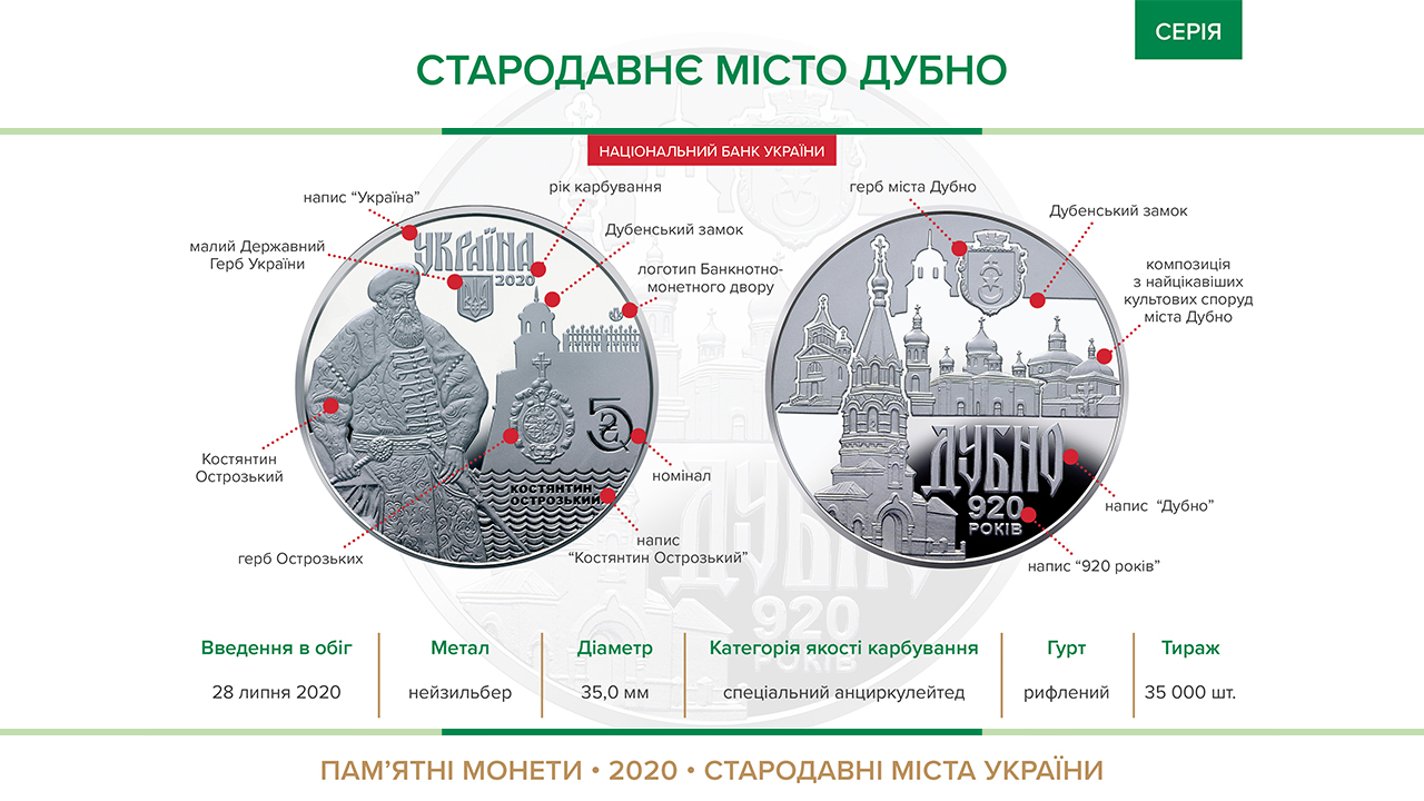 Загальний тираж – 35 тисяч штук. На монеті зображена композиція з культових споруд Дубна, а також зображення князя Костянтина Острозького, адже місто входило до його володінь.