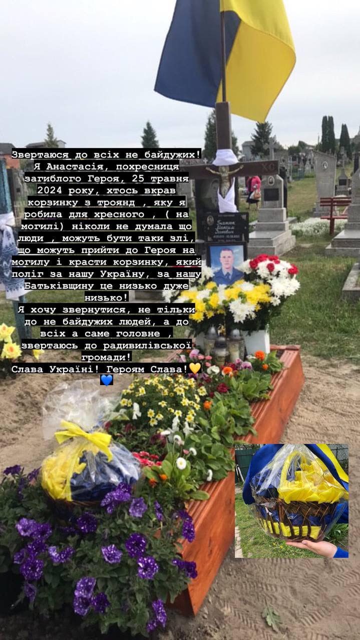 "Ніколи не думала, що люди можуть бути такі злі, що можуть прийти до Героя на могилу, який поліг за нашу Україну, за нашу Батьківщину, і вкрасти корзинку. Це низько, дуже низько", - ідеться в дописі Анастасії.