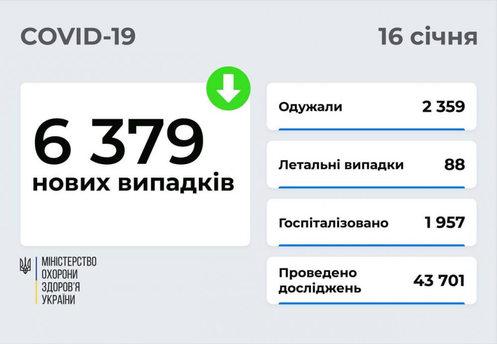 За добу 15 січня в Україні зафіксовано 6 379 нових підтверджених випадків COVID-19. Зокрема, захворіли 503 дитини та 92 медпрацівники.