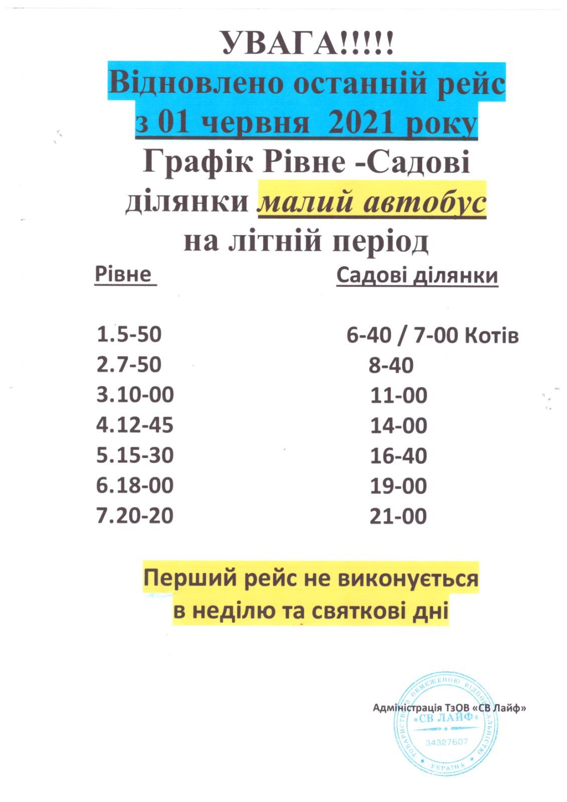 Поки що мова не йде про залучення іще однієї машини. Втім, повернутися з міста в приватну оселю можна буде пізніше.   Зокрема, адміністрація ТзОВ СВ "Лайф"(саме цей перевізник обслуговує маршрут), офіційно повідомляє, що з 1 червня буде відновлений рейс о 20-20 год. з Рівного. Відправлятиметься автобус з центрального автовокзалу ("Андріївський").   Шукайте нас ??? Офіційний сайт Соціальні мережі: ► Ми у Facebook ► Ми в Instagram ► Наш Telegram-канал