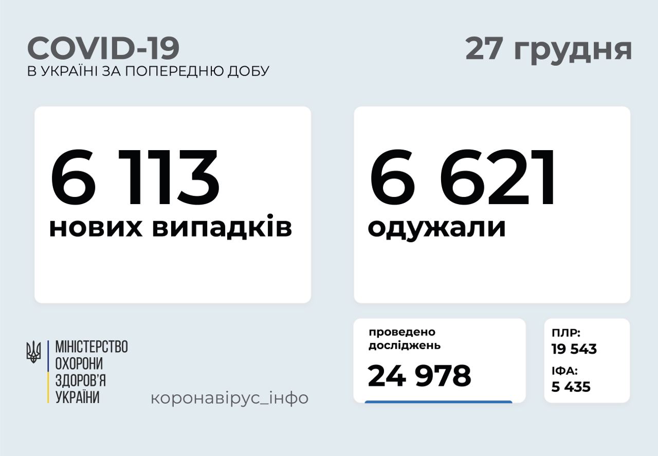 6 113 нових випадків коронавірусної хвороби COVID-19 зафіксовано в Україні станом на 27 грудня 2020 року. Зокрема, захворіли 277 дітей та 153 медпрацівники.