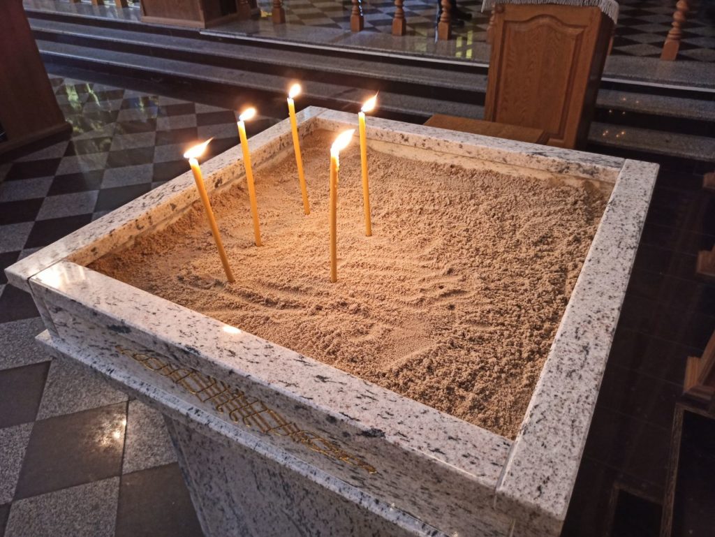 «Ми сьогодні їх символічно відкривали з владикою Іларіоном та Віктором Шакирзяном. Ці підсвічники унікальні тим, що зроблені з каменю і наповнені піском. Свічки можна ставити на пісок, а потім його змінювати, це на відміну від старих підсвічників, дуже зручно. Тому ми звернулися до Віктора Шакирзяна, щоб він посприяв у встановленні цих підсвічників. Вони зроблені з італійського граніту, їх довго робили і от, напередодні Покрови, ми маємо готові свічники», - розповів протоієрей Василь Рудніцький.