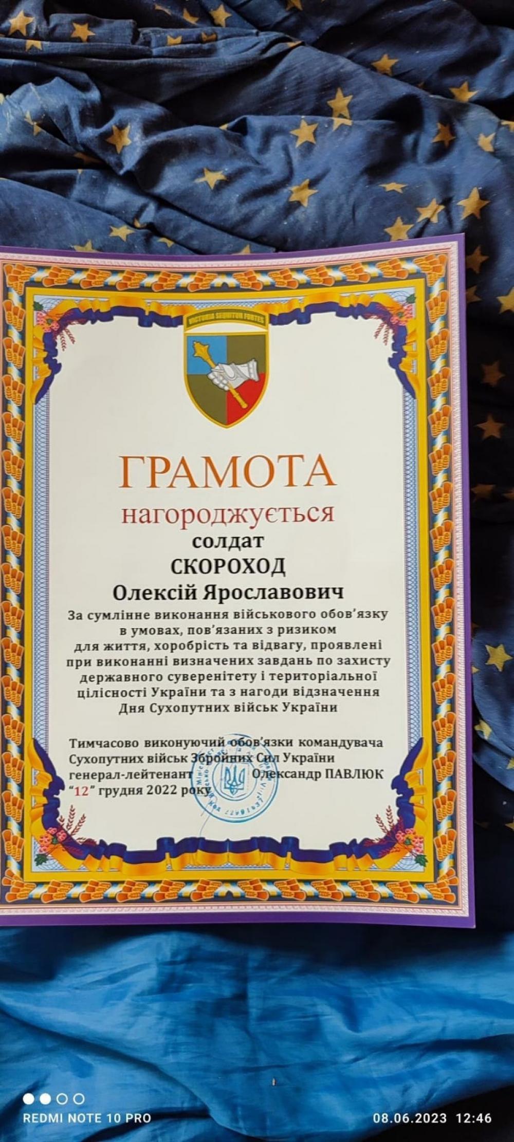 Жителя Дядьковицької громади Скорохода Олексія Ярославовича нагородили грамотою.