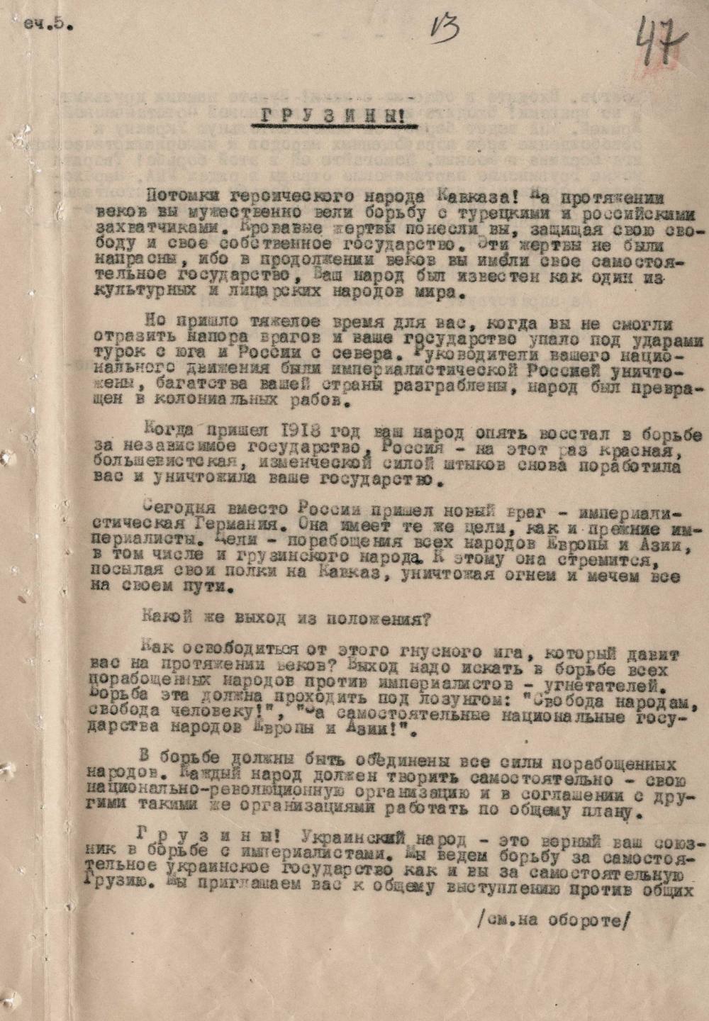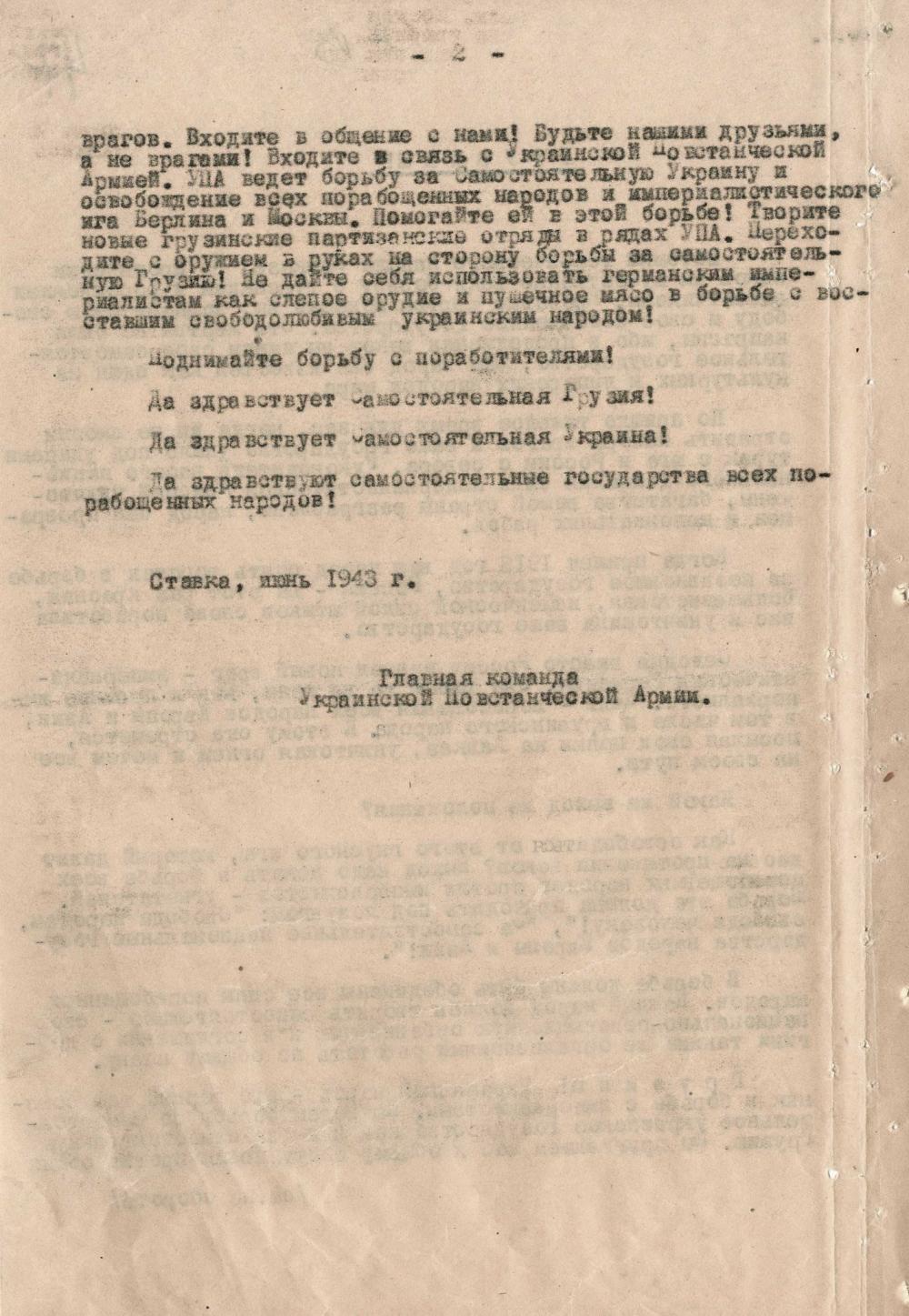 А грузинам адресовані такі слова: «Грузины! Потомки героического народа Кавказа! На протяжении веков вы мужественно вели борьбу с турецкими и российскими захватчиками. Кровавые жертвы понесли вы, защищая свою свободу и свое собственное государство… Украинский народ – это верный ваш союзник в борьбе с империалистами. Мы ведем борьбу за самостоятельное украинское государство, как и вы за свою самостоятельную Грузию. Мы приглашаем вас к общему выступлению против общих врагов…».