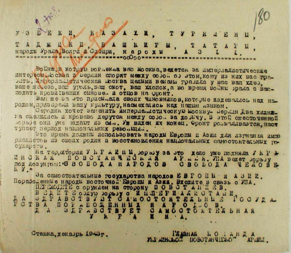 У наказі командира Української повстанської армії «Клима Савура» від 31 серпня 1943 р. зазначено: «Звʼязатися з членами інших поневолених народів, що перебувають у цей час в Україні. Допомогти їм організуватися при УПА в їхні національні повстанські загони для боротьби зі спільними нашими ворогами, Берліном і Москвою. Сьогодні ця боротьба йде за ослаблення імперіалістів, а в майбутньому вийдуть з України національні легіони на свої рідні землі і будуть пліч-о-пліч вести революційну боротьбу з імперіалістами за наші вільні національні держави».