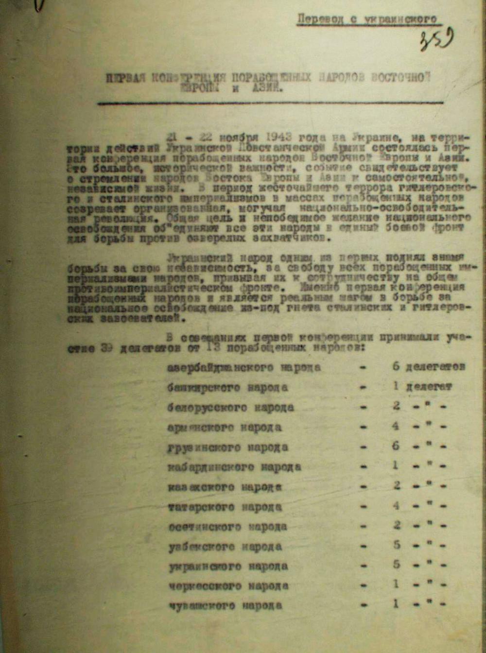 Наявність такої кількості представників інших народів в УПА стало поштовхом до проведення Першої Конференції поневолених народів Східної Європи та Азії. Вона відбулася 21–22 листопада 1943 року в селі Будераж Здолбунівського району на Рівненщині. У звіті про цю подію, який зберігається в архіві розвідки, зазначається, що в роботі конференції взяли участь 39 делегатів від 13 національностей: 6 грузинів, 6 азербайджанців, 5 узбеків, 5 українців, 4 вірменина, 4 татарина, 2 білоруса, 2 осетина, казах, черкес, кабардинець, чуваш, башкир.