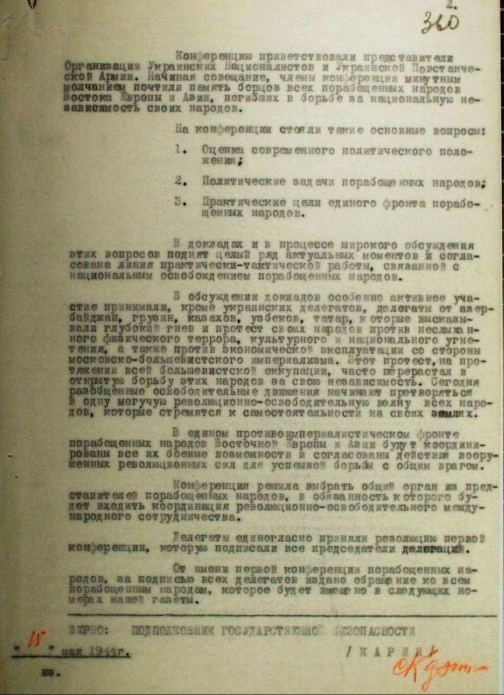 Спершу учасники хвилиною мовчання вшанували пам’ять борців усіх поневолених народів, що загинули у боротьбі за національну незалежність. Потім була низка доповідей і обговорень політичної ситуації, завдань і практичних цілей поневолених народів. «В обговоренні доповідей, – зазначається у звіті, – особливо активну участь брали, крім українських делегатів, делегати від азербайджанців, грузинів, казахів, узбеків, татар, які висловлювали глибокий гнів і протест своїх народів проти небаченого фізичного терору, культурного і національного гноблення, а також проти економічної експлуатації з боку московсько-більшовицького імперіалізму…». Зрештою всі учасники зійшлися на необхідності створення спільного фронту для «боротьби за національне визволення з-під гніту сталінських і гітлерівських завойовників».