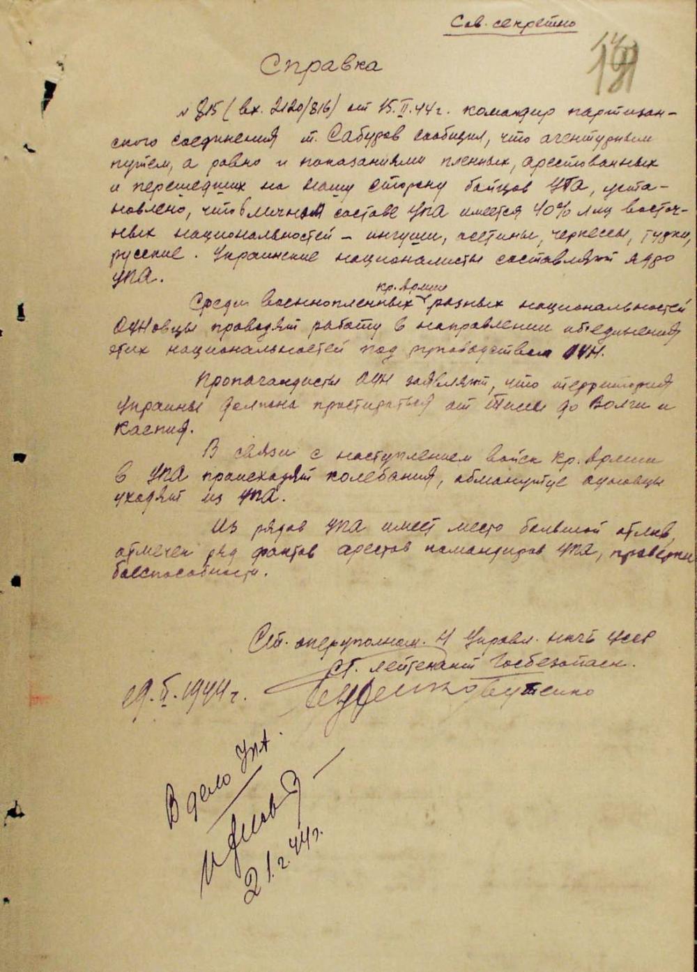 У довідці НКДБ УРСР від 19 лютого 1944 року зазначається: «Командир партизанського зʼєднання т. Сабуров повідомив, що агентурним шляхом, так само як і свідченнями полонених, заарештованих і тих, що перейшли на наш бік бійців УПА, встановлено, що серед особового складу УПА є 40% осіб східних національностей – інгуші, осетини, черкеси, турки, росіяни. Українські націоналісти становлять ядро УПА. Серед військовополонених Червоної армії різних національностей ОУНівці проводять роботу в напрямку обʼєднання цих національностей під керівництвом ОУН».