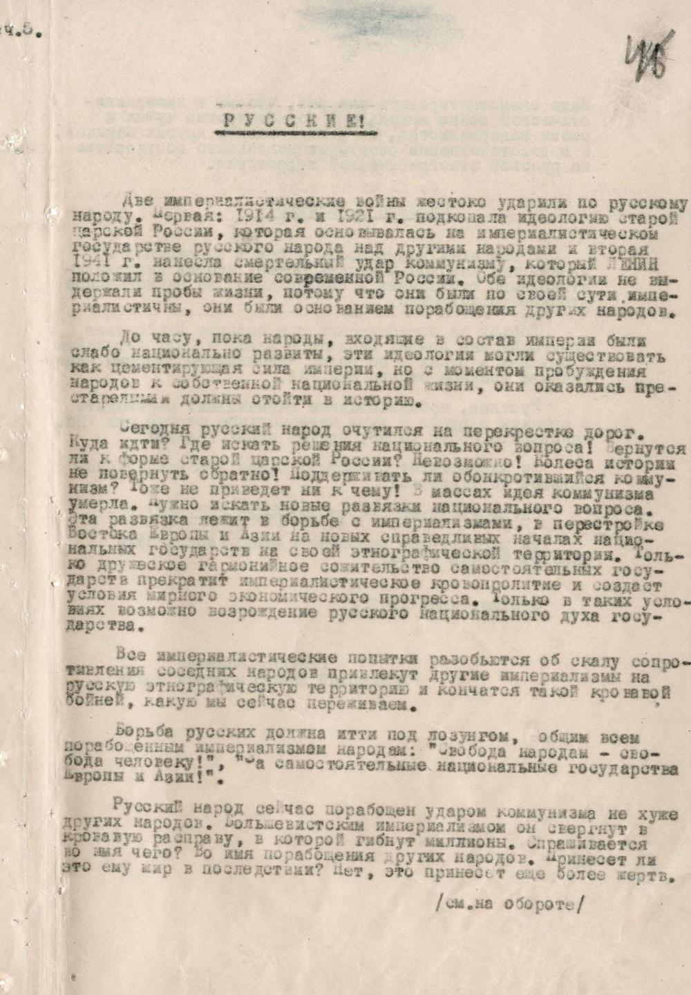 УПА рішуче відмовилося від яскраво вираженої антиросійської політики. Навпаки, використовувало найменший шанс залучити до своїх лав росіян, які не були задоволені радянською владою і тим паче новим порядком німецьких окупантів. При цьому автори цієї та інших листівок постійно апелювали до патріотизму і почуттів національної гідності в боротьбі проти спільного ворога – гітлерівського й московсько-більшовицького імперіалізму.