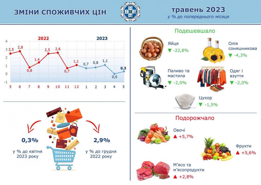 Водночас на 22,8% подешевшали яйця, на 5,9–0,1% знизилися ціни на шоколад, сало, олію соняшникову, інші продукти переробки зернових, кондитерські вироби з борошна, цукор, молоко, рис, яловичину, масло, рибу та продукти з риби, сири.