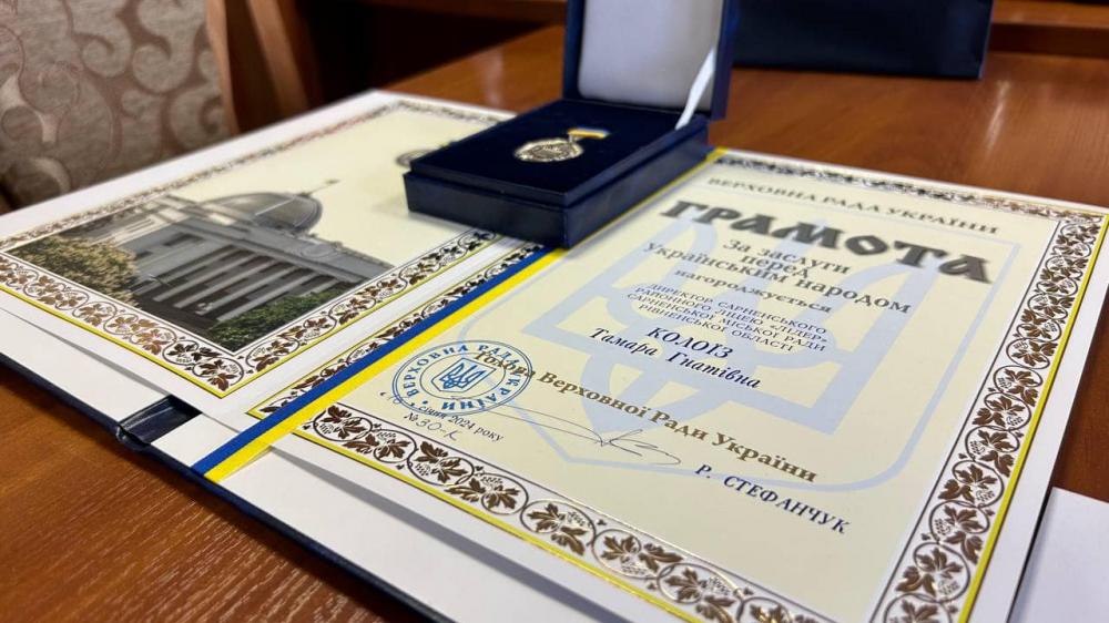 Грамоту Верховної Ради України вручили заслуженій вчительці України, багаторічній керівниці одного з найкращих закладів освіти Сарненської громади Тамарі Колоїз.