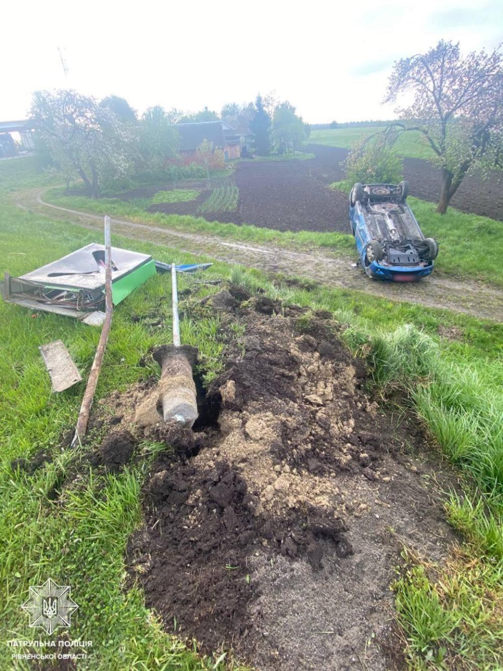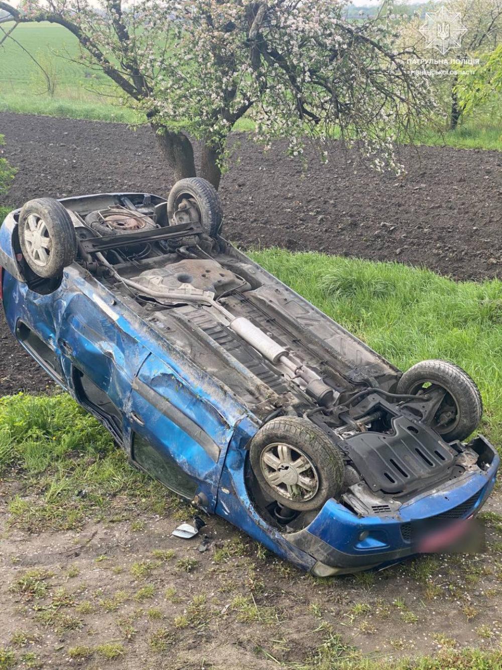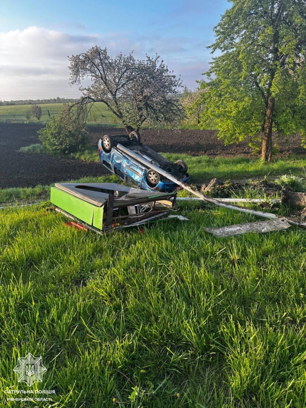 Як повідомили в пресслужбі патрульної поліції Рівненщини, автомобіль Dacia Logan збив дорожні знаки, злетів у кювет і перекинувся на дах. Керманич при цьому травм не отримав.