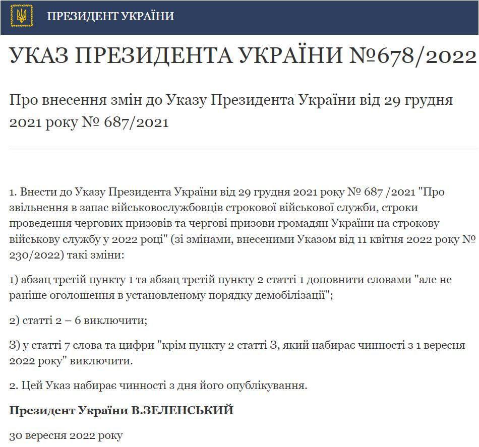 Згідно з новим указом, запланована на жовтень-грудень демобілізація відкладена на термін «не раніше оголошення в установленому порядку демобілізації». Призов, який мав відбутися в ці місяці, скасовано.