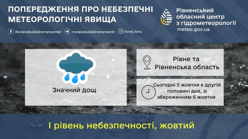 Як повідомляють ,у Рівненському обласному центрі з гідрометеорології,Сьогодні 5 жовтня, в другій половині дня, із збереженням впродовж доби 6 жовтня, по м.Рівне та області оікується значний дощ.