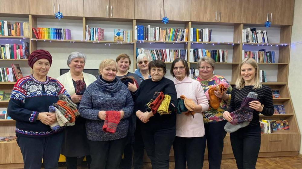 Жительки Костополя в'яжуть речі для військових у міській бібліотеці.
