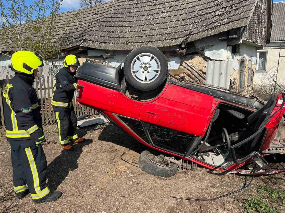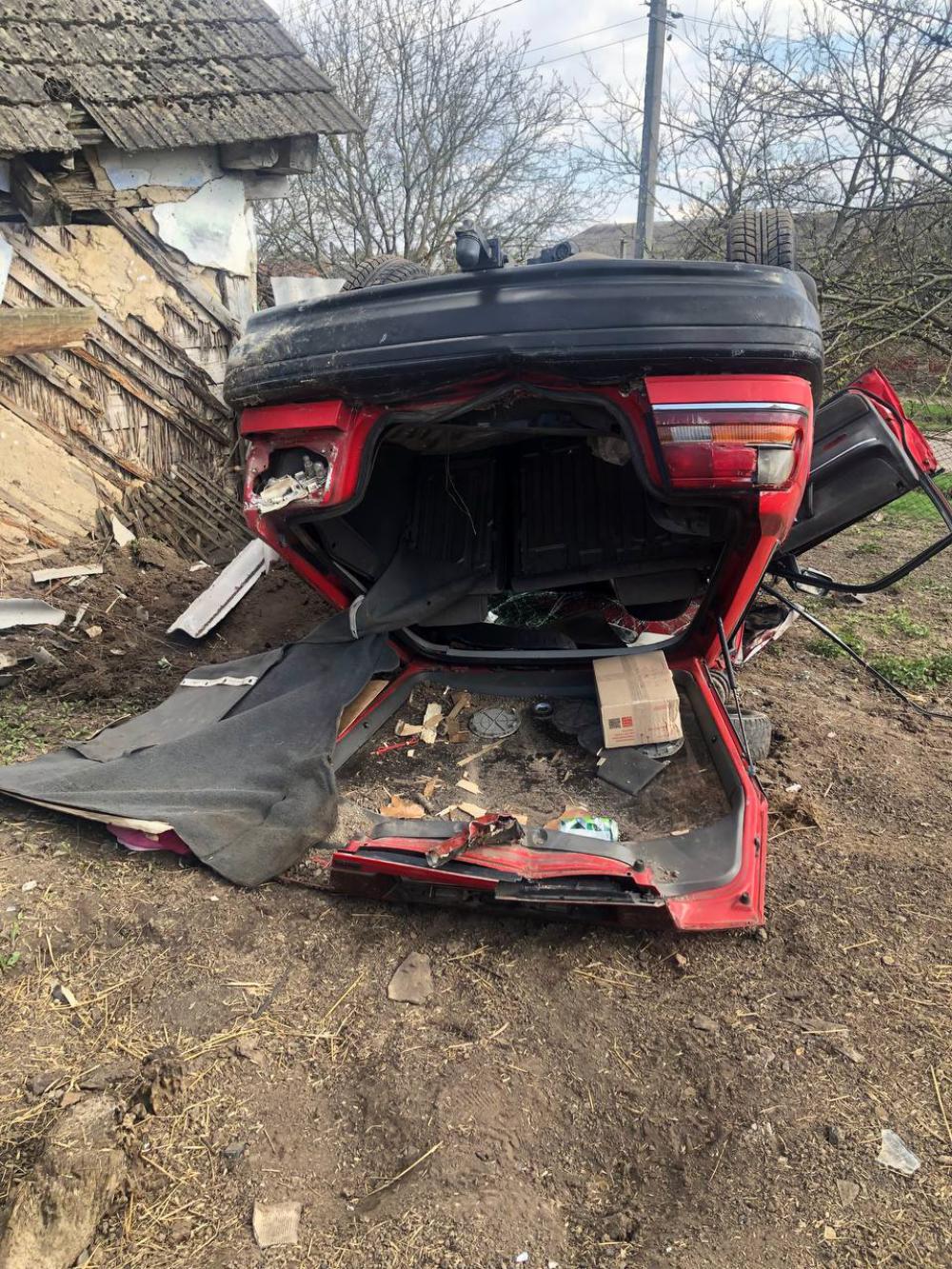 В селі Мирогоща Дубенського району легковик зніс стовп, в`їхав у двір та перекинувся.