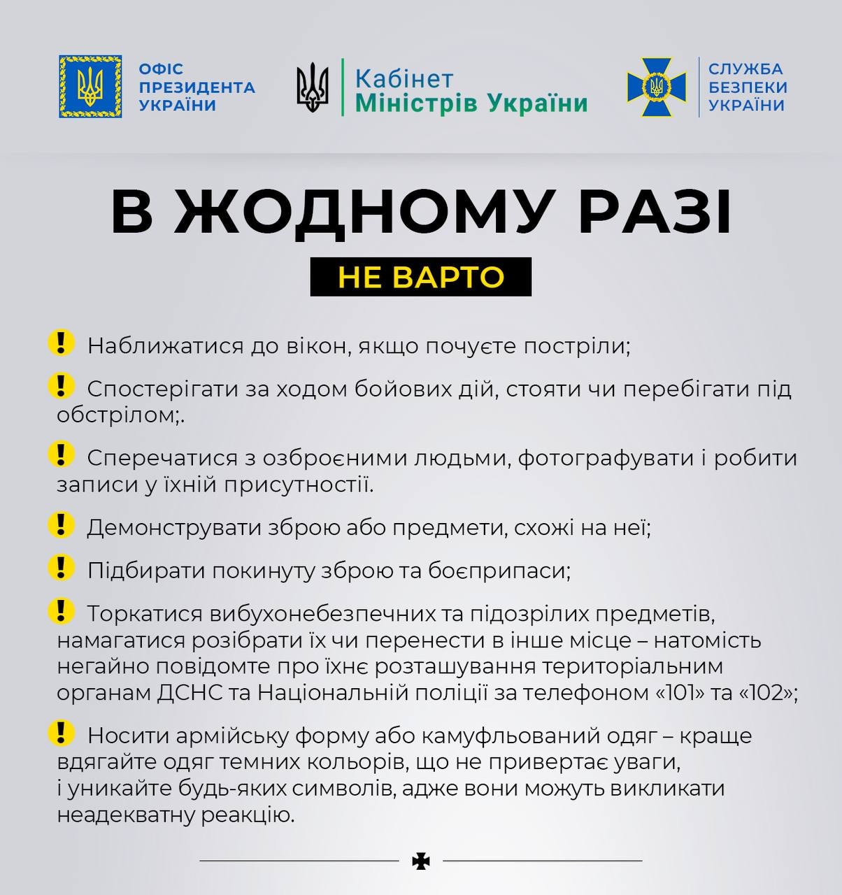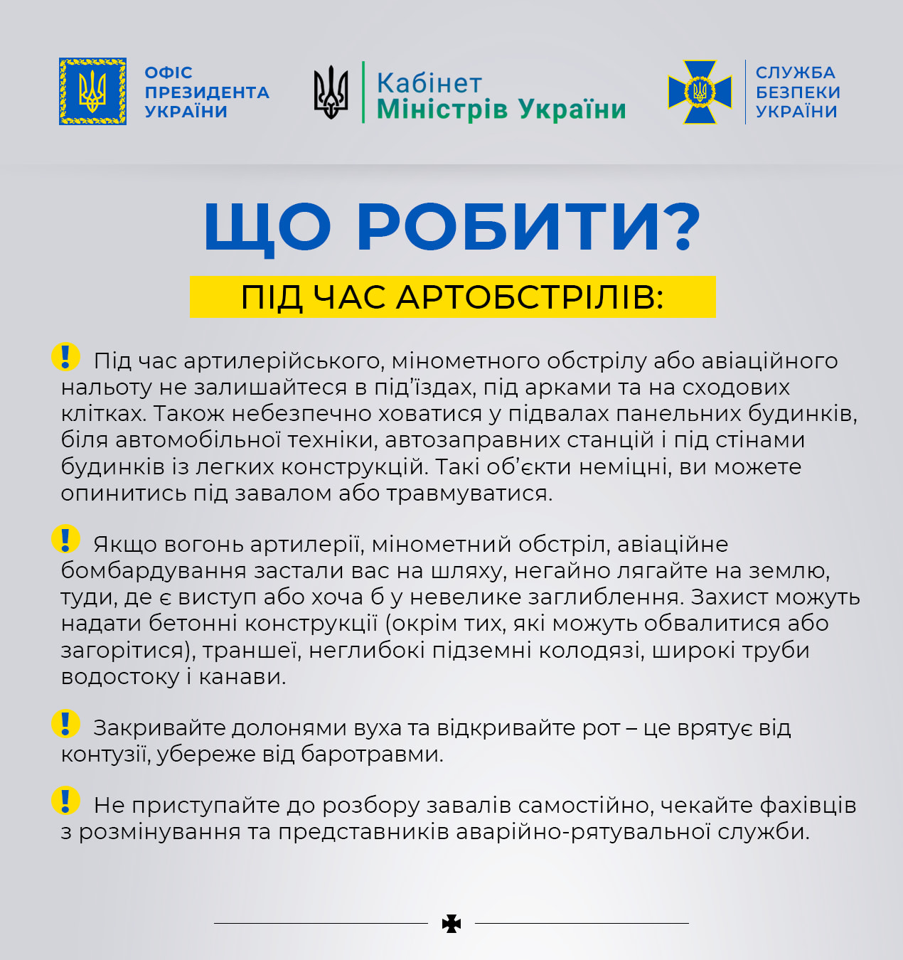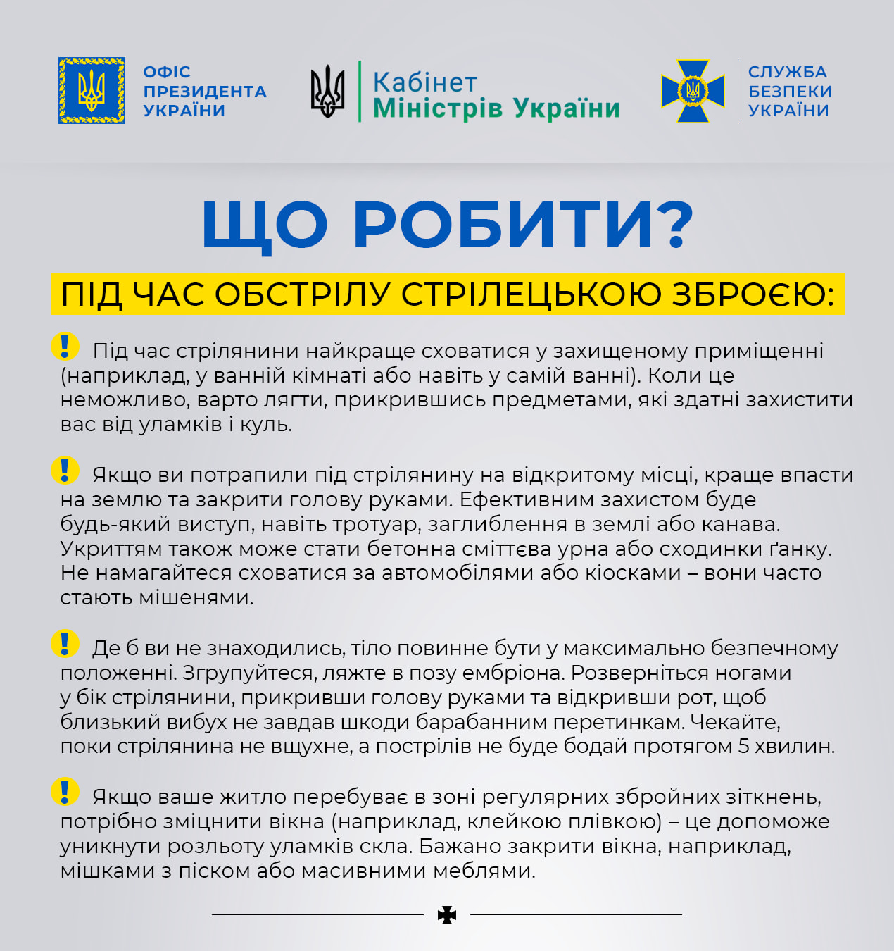 Служба безпеки України опублікувала короткі інструкції як діяти у надзвичайних ситуаціях. А саме, що робити під час артилерійських обстрілів системами залпового вогню, під час артобстрілів, під час обстрілу стрілецькою зброєю, а такоє в надзвичайній ситуації або в зоні бойових дій. І головне, чого робити в жодному разі не варто.